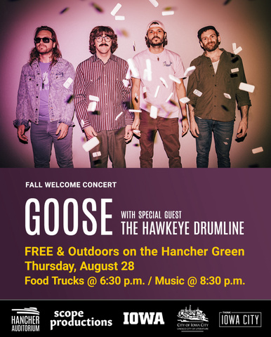 This year SCOPE Production is teaming up once again with Hancher Auditorium to host the highly anticipated Fall Welcome Concert. All are welcome and encouraged to join the free event on the Hancher lawn and listen to the funky, blues, rock tunes of the band Goose on August 28th to enjoy the genre lending sounds of Goose.