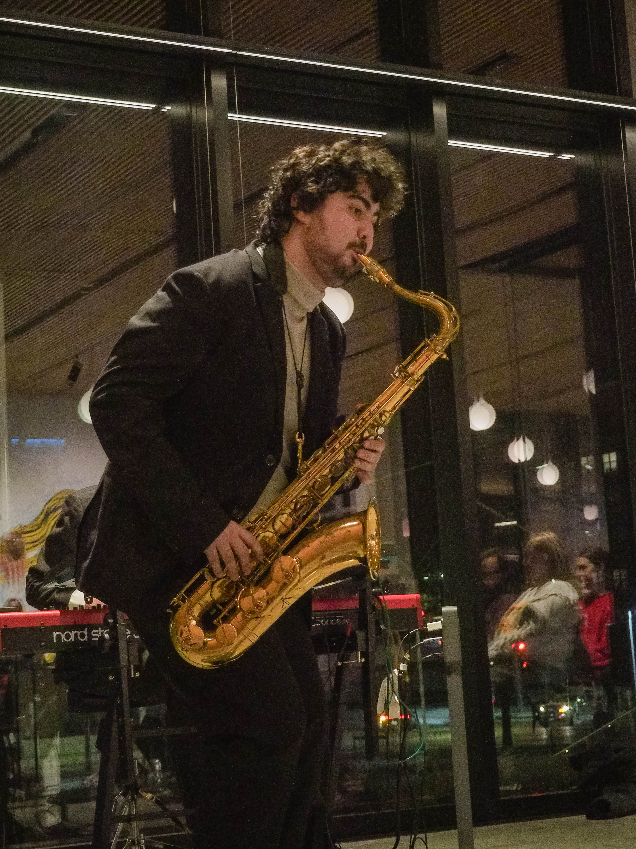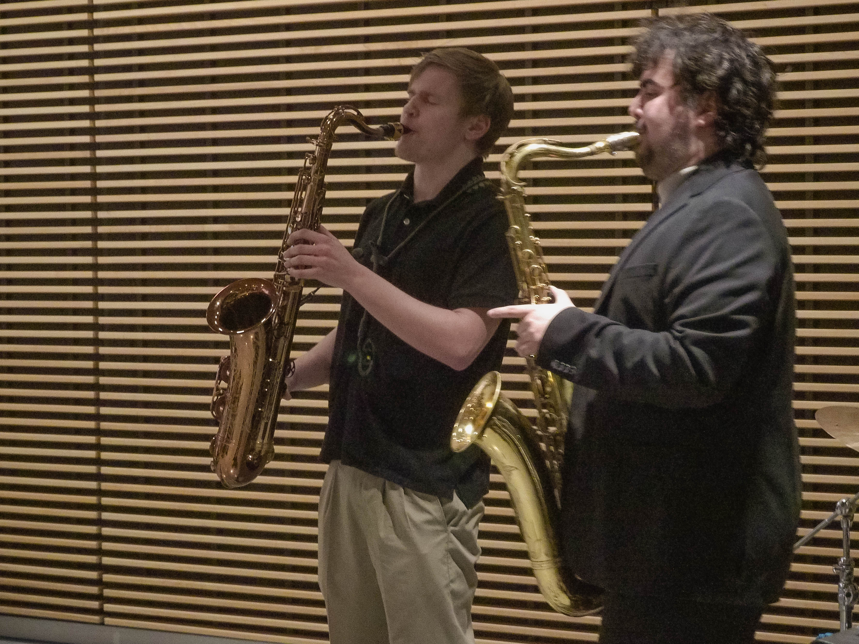 Two student ensembles shared the stage for the evening. The Ben Banta Trio opened with a 30-minute set, followed by an equally engaging performance from the Mathuin Smith Trio. Both saxophone groups were accompanied by the same drummer, Milo Savage, whose presence tied the two acts together. To close out the night, the musicians from both trios joined together for a final collaborative song, bringing the evening to a memorable finish.