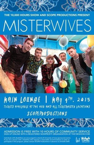 IOWA CITY- SCOPE Productions and 10K are excited to announce that MisterWives will be performing in the IMU Main Lounge on Monday, May 4th, 2015 for the annual 10,000 Hours Show. The show will start at 8 p.m., with doors opening at 7 p.m.